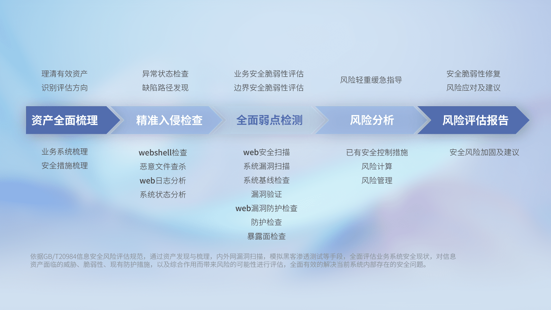 针对客户行业特性,,,,以专业的安全服务+多厂商联合解决方案提供专属的一站式安全管理服务,,,,帮助客户全面感知网络空间威胁,,基于识别、、、、检测、、、、分析、、、、防护、、监测、、、、响应的服务理论模型,,,从方案咨询、、集成交付、、评估验证、、、、优化加固、、、、运维运营,,致力于为客户提供完整的闭环管理式安全服务。。。。以实战经验为客户打造高抵御风险的安全体系,,,帮助客户发现威胁、、、对抗威胁、、、处置威胁,,不断积累安全对抗能力,,持续保障数字化安全。。。